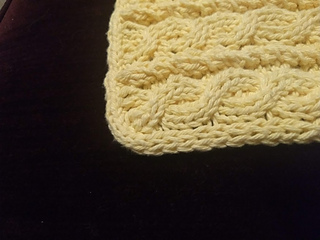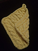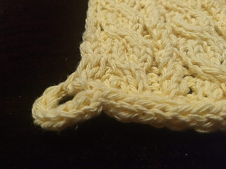 This is a square, flat, knitted cotton hot pad with an optional hanging loop. It works up nice and thick, especially after machine washing in hot water. Size 7 or size 8 needles can be used, and there is a great deal of flexibility over which size and type of needles to use for the cables.
