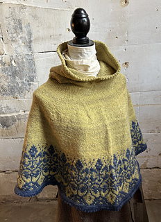 The size of both hood and cape are adaptable, and the cape shape & length are customisable within the recipe. The pattern includes 2 sizes of hood, and cape sizes ranging from shoulder &/or bust circ of 78-160cm (31-63”).