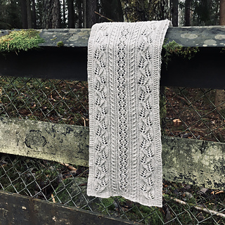 The Maridal scarf features lacy cables, slipped stitches, and leaves. The motif is easy to memorize but not boring, and the scarf works up quickly. I suggest using a yarn with good stitch definition to show off the cables and slipped stitches in particular.