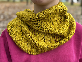 The Marigold Twist Cowl is a cozy, textured accessory that combines soft cables with delicate lace for a beautifully structured finish. Measuring 60 cm in circumference and 30 cm in height, it sits comfortably around the neck while showcasing its elegant stitchwork.