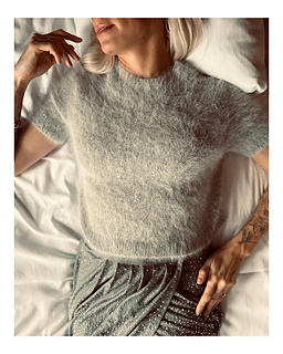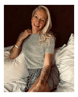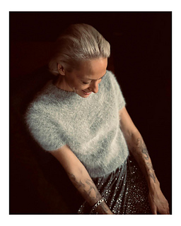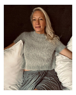 The Marilyn sweater is worked top-down and includes German short rows at the back neck for a better fit. The chosen yarn is perfect for this: it adds a light halo and luxurious softness. The ribbing is finished with a striking Italian bind-off. Wear your Marilyn sweater to a party or for everyday life, wear it just for yourself or to turn heads — imagine how lovely it would be in red or black. I might have to cast on a second one immediately.