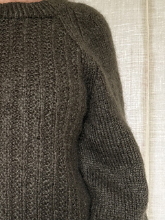 MARIZA est un pull tout en douceur et en simplicité, tricoté en fausses côtes anglaises sur le devant et le dos, avec des manches en jersey.