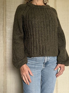 Ce modèle a été réalisé avec le fil de Biches & Bûches « Le Gros Silk & Mohair » composé de 28% Soie de Mûrier (Mulberry Silk) + 72% Mohair Super Kid (Kid Mohair) dans le coloris Kaki foncé