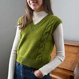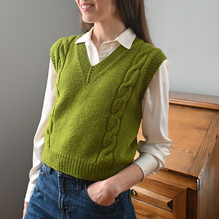 Martini is a chic slipover with a V-neckline. It features large cables that give a modern twist to this classic piece. It can be worn on its own or layered over a blouse or t-shirt. This garment is knitted in a DK weight yarn. You can also choose a fingering weight yarn held together with mohair for a softer, more airy look.