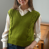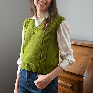 Martini, c’est un débardeur chic avec une avec encolure en V. Il se caractérise par un jeu de grosses torsades faciles à réaliser qui modernise cette pièce très classique. Il se porte seul, ou par-dessus une blouse ou un t-shirt. Cette pièce est tricotée dans un fil de grosseur DK. Vous pouvez aussi opter pour un fil de grosseur fingering doublé d’un mohair pour un rendu plus vaporeux.
