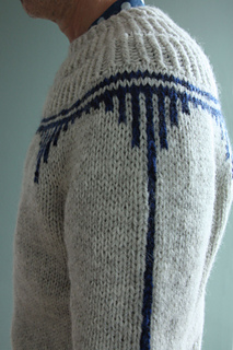 The sweater is worked top down, using twisted rib, colourwork and crochet chain stitches.
