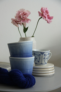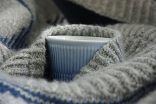 The minimalist aesthetic is inspired by the classic Danish musselmalet tableware. The marled blue lines echo the hand-painted character of the decor, while the ribbed yoke is reminiscent of the rim of a plate.