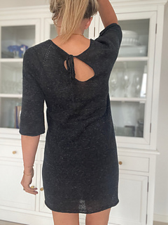 Mary Dress is a simple short-sleeved dress with a slit and bow at the back of the neck, knitted in a lovely blend of linen and silk. The dress is short and drapes softly and loosely.