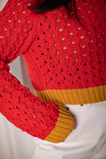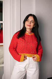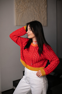 Ажурний джемпер виконується без швів, зверху донизу. Горловина спинки та переду формується укороченими рядами. Зручна безшовна конструкція – реглан-погон, завдяки якій легко визначити потрібну довжину тулубу та рукавів, приміряючи у процесі в’язання.