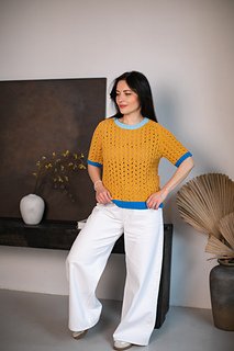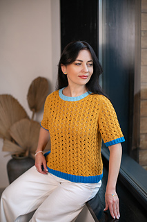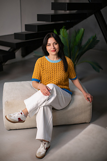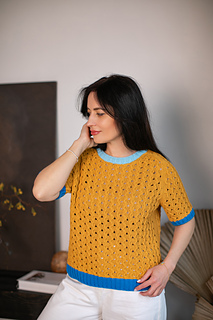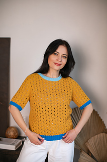 If you use other yarn, you need 960 (1040, 1120, 1200) m for short sleeve or 1200 (1300, 1440, 1600) m for long sleeve. Colour № 1 (neck band) 60 - 70 m, and colour № 2 (hem and cuffs) 160 m.