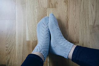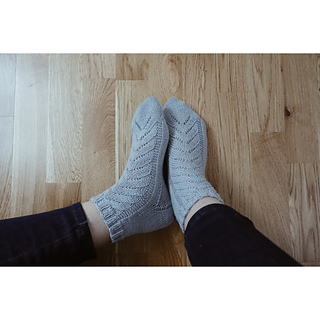These are cuff-down knitted socks with a lace pattern knitted on the top of the leg. I used a turned heel in this pattern. My socks are knitted with Schachenmayr Regia Premium Silk 4-ply yarn, but any 4 ply yarn will do. One skein of yarn (100 g) should be enough to knit not only two socks but four! That means you can knit a pair for yourself and another for you friend using only one skein of yarn.