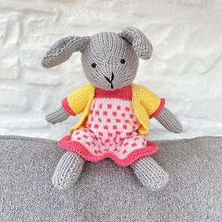 This pattern is suitable for knitters who can cast on and off, work knit stitch, purl stitch and increase/decrease. The spotty dress pattern is a clear introduction to simple colourwork knitting with lots of photographs to help you step-by-step through the process of knitting the spots, and the bunny and clothes are all knitted flat so no working in the round is needed.