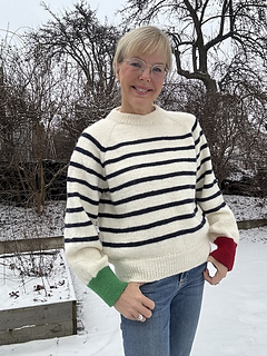 Tröja som stickas uppifrån och ner med raglanökningar och marint randad. För att hålla reda på babord och styrbord är vänster ärmmudd röd och höger är grön. Tröjan på bilden är stickad i Peer Gynt storlek M med en rörelsevidd på 25 cm.