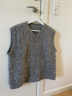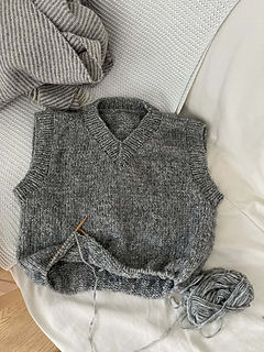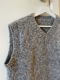 The back piece is made first. Then, stitches are picked up for the shoulders. These are worked separately before they are connected and worked back and forth. Afterwards, the front piece and the back piece are connected and the rest of the body is worked in the round and finished with ribbing at the bottom of the slipover. Ribbing is also added to the armholes and the neckline.