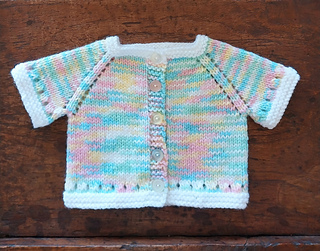 This cute little cardigan for a baby of around 0 - 3 months, has a simple shape - and pretty eyelet rows.