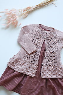 The cardigan is knitted from the bottom up, starting with a ruffle and then knitted in stockinette st as well as a pattern is knitted in the front on both sides. The cardigan is knitted front and back in rows.