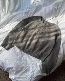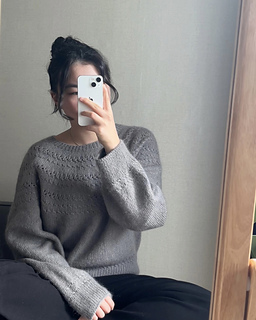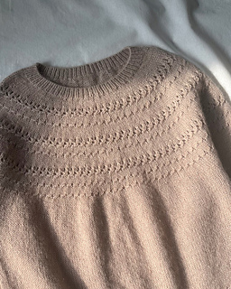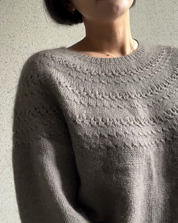 The neckline is worked in the round with a ribbed collar, shaped using German short rows for a comfortable and natural fit. The textured motif flows seamlessly as the yoke increases, reaching the armholes. After setting aside the sleeve stitches, the body is worked first, followed by picking up the sleeve stitches to complete the sleeves. This pattern follows a classic top-down yoke construction and includes both written instructions and charts with illustrations, making it accessible even for adventurous beginners.