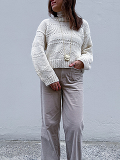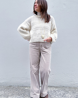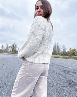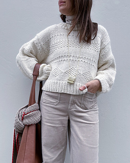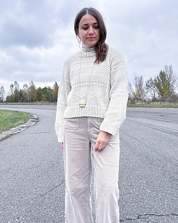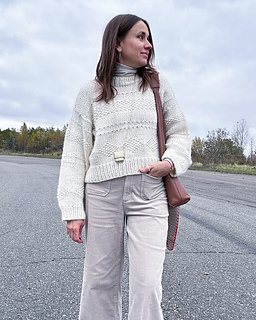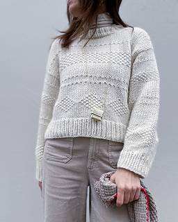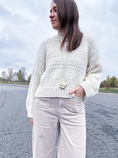 At first, you work body in the round to the underarms. Then divide for back and front and work yokes flat separately. Once back and front yokes are finished, shoulders are joined together using Three needles bind-off method. Stitches for sleeves are picked up along the armholes and sleeves are worked top down in the round. The last touch – stitches for mockneck are picked up and worked in the round.