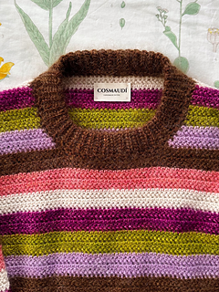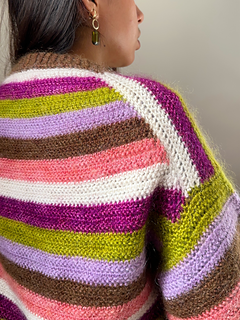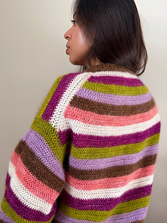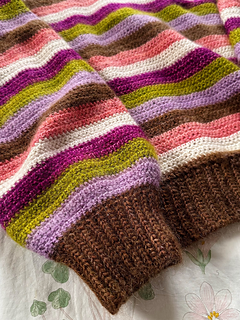 The sample in the listing photos was crocheted with Manos del Uruguay Alegria in the colors Citric, Crema, Nocciola, Nymph, Strawberry, and Wild Orchid, held with Manos del Uruguay Cabrito in the colors Citric, Magenta, Natural, Nocciola, Nymph, and Sorbet.