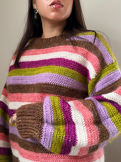 This pattern comes with instructions for 9 sizes: XS (S, M, L, XL, 2XL, 3XL, 4XL, 5XL) from bust circumferences of 28-62 in 71-158 cm. The size guide and measurements for the sweater itself can be found within the pattern.