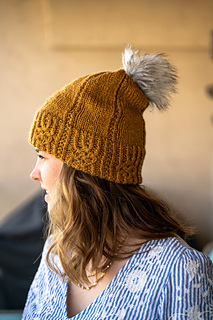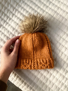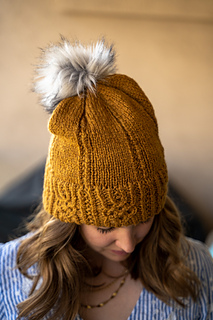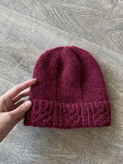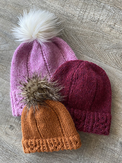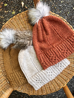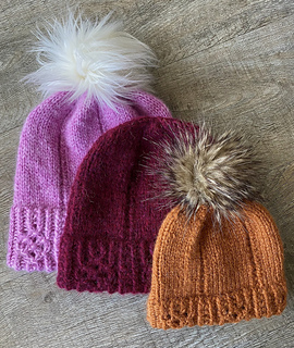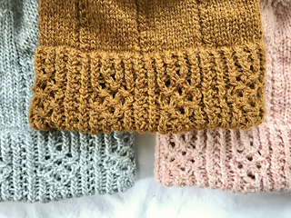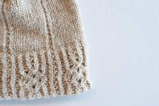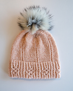 mixed with a folded-over brim to keep your ears nice and warm. The lace pattern is simple, perfect for a beginner. Knit through the back loop is used to create defined ribbing throughout the hat.