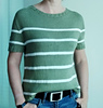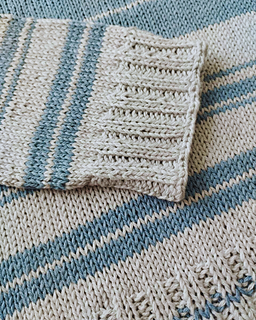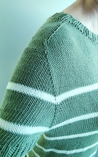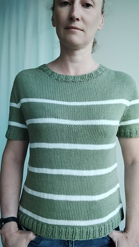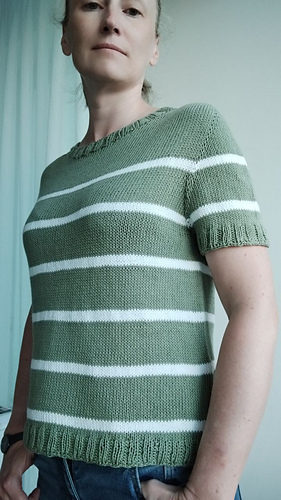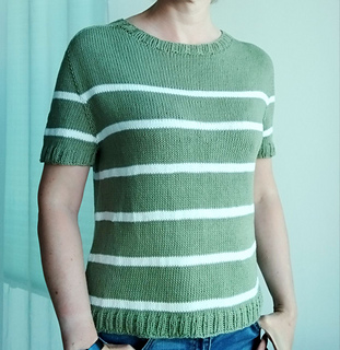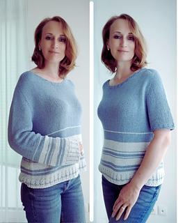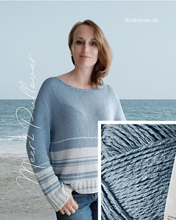 DE: „Meer Pullover/Tee“ - ist ein leichter, sommerlicher Pullover. Er wird nahtlos von oben nach unten in glatt rechts gestrickt. Für den Halsausschnitt werden verkürzte Reihen verwendet. In der Anleitung sind Varianten mit langen und kurzen Ärmeln enthalten – Sie können nach Wunsch wählen. Der Farbwechsel der Streifen ist in der Anleitung angegeben.