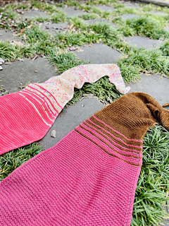 You can use one colour for the whole shawl and ignore the transition stripes, or you can embrace the opportunity for colour play and let your imagination run wild with colours and yarn. I have used two colours in both samples.