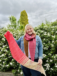 The Small size is designed to use up to two 100g skeins of DK weight (8ply) yarn. One skein will be your MC and the other will be your CC. Unblocked, the size Small has a length of approximately 1.6m and it can be blocked out to around 2m. The widest part of the shawl measures around 30 cm when blocked.
