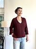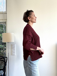 Sleeve stitches are picked up around the armholes and the sleeves are worked in the round from the top down. A few decreases shape the ¾-length sleeves, and the cuffs with slits are finished with a wide 2x2 rib.