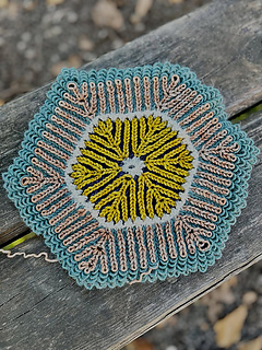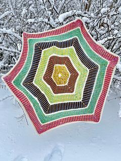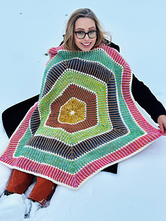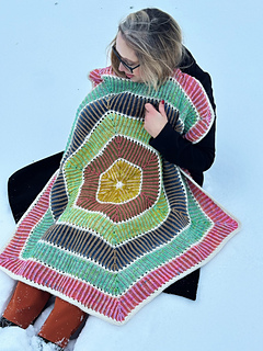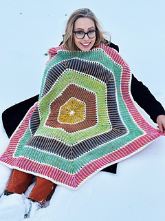 The blanket is a one-piece design worked in the round from the center out, beginning with Emily Ocker’s Cast On. This cast on allows the yarn tail to be pulled tight, virtually eliminating the hole at the center. The piece grows outward into a square, expanding to the edges. Although originally designed as a blanket, it also makes a lovely folded shawl. The growing shape creates a balanced, symmetrical design, with each round adding to its unique beauty.
