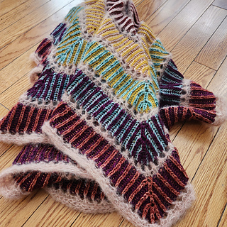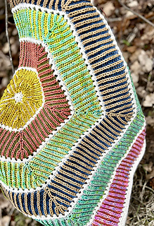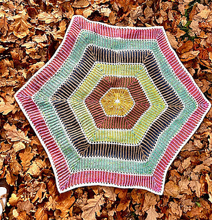 Each increase round features six corner increases, resulting in six identical sections radiating from the center. The blanket is finished with an I-cord edging. Between brioche sections, airy interludes provide contrast and rhythm to the design. Using stitch markers will help you keep track of the increases. Because of the large number of stitches, it is worked on circular needles—possibly two or even three at a time to accommodate the size.