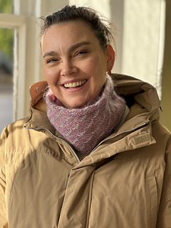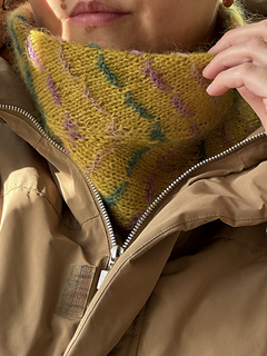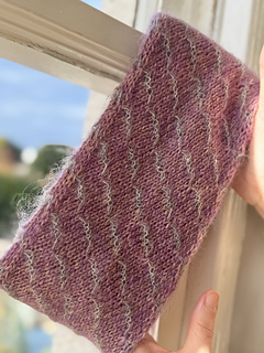 The Mene Cowl is a great canvas for using up small leftovers of mohair silk laceweight yarn, with each 2-round stripe of CC using only 0.25g. As there are 18 of
