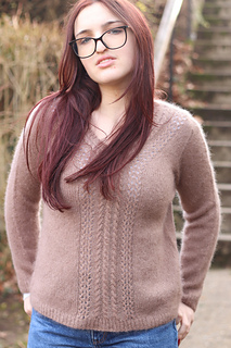 Its V-neckline is highlighted by a cable motif that flows downward and meets at the front, creating a refined and timeless silhouette.