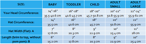 TODDLER – 16-18” (40.6-45.7cm) head circumference, finished measurement 16” (40.6cm)