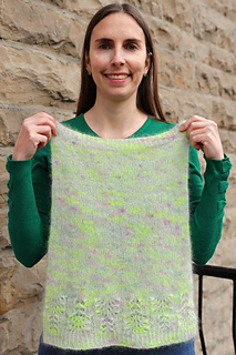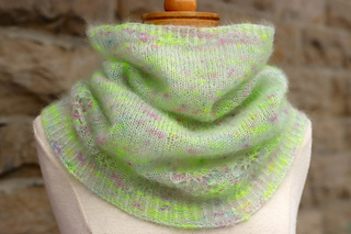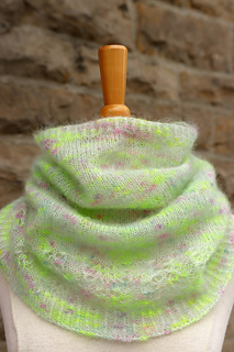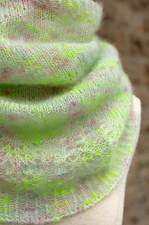 Laine: 1 écheveau de Mohair Lace par The Wandering Flock (80% mohair super kid, 20% soie; 393 yards (430 m)/50 g) ou approximativement 302 m (330 yards) d’une laine mohair grosseur dentelle ou d’une laine similaire. Le modèle a été tricoté avec la couleur Mermaid Parade.