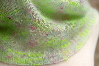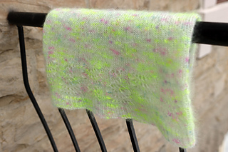 Yarn: 1 skein of Mohair Lace by The Wandering Flock (80% super kid mohair, 20% silk; 430 yards (393 m)/50 g) or approximately 330 yards (302 m) of mohair lace weight yarn or similar yarn. The sample was made using colorway Mermaid Parade.