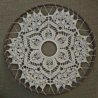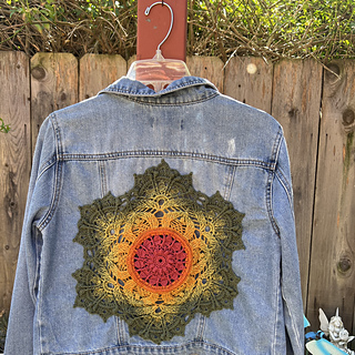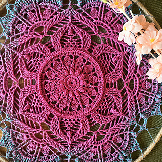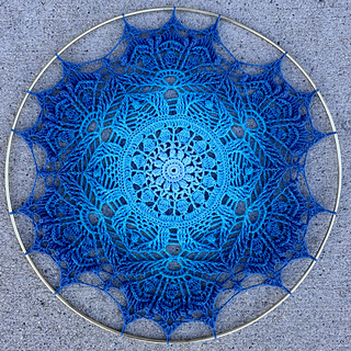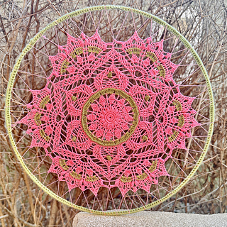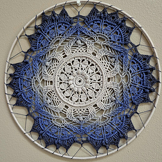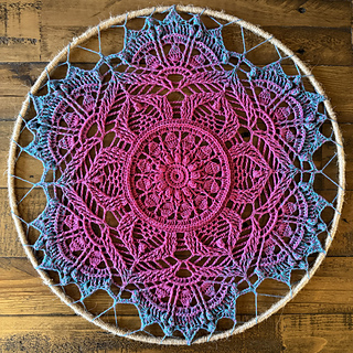 Any size yarn and matching crochet hook will work with this pattern. Your materials and tension will determine finish size and hoop size if finishing to a mandala. Using recommended yarn and hook, this pattern will be 14” in diameter after blocking and fit to a 16” hoop if mounting.