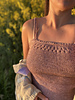 The Michelle Top is a feminine top with a simple design and subtle romantic features. It features straps with two cords, while the body of the top is worked in stockinette with two rows of eyelets along the top. The top is finished with an i-cord along the top and bottom as well as the picot crochet edging. Two strands of yarn are held together throughout the entire piece, giving it a durable fit, while four strands are held together for the straps and one strand is used for the picot trim.