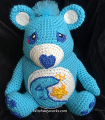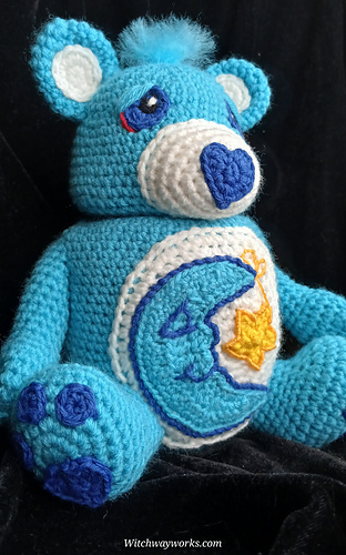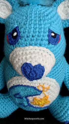 This charming crochet pattern features instructions to conjure your own beautiful sky-blue bear with a fluffy turquoise hair tuft, sweet heart-shaped nose, and a large white belly patch showcasing a glowing crescent moon and a golden hanging star. His paws and ears are accented with deep blue details, giving him a magical, nighttime vibe that feels both cozy and whimsical.