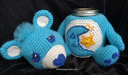 The finished bear stands approximately 10.5 inches tall and measures about 9 inches wide when crocheted with Red Heart yarn. His body is perfectly shaped to hold a standard mason jar (jar shown in photos is for display only and not included), making him a functional and eye-catching stash jar or desk companion.