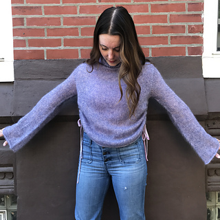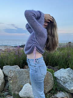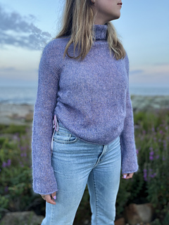 One, two, or three strands of mohair held together allow you to customize the sheerness of this gauzy, ethereal cropped turtleneck with gathered sides, inspired by Taylor Swift’s “Lavender Haze.”