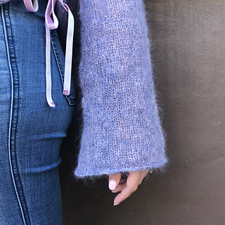 This sweater can be knit with one, two, or three strands of mohair/silk yarn to create the desired level of sheerness. One strand will produce a very sheer, mesh-like fabric. Two strands will create a gauzy, semi-sheer fabric. Three strands will create a virtually opaque fabric with a substantial halo and silky sheen. Adjust the needle size to achieve the correct gauge. In my hands, a single strand required size 9 needles to achieve gauge, two strands required size 7, and three strands size 6.