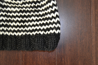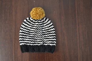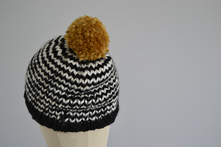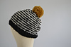 Nothing beats a black and white striped hat, it goes with everything! And while I don’t typically wear a lot of color myself, a red pom pom seemed like the perfect thing to top off this classic. Because of the graphic color work, this hat looks great with the Cassie Finger mitts.