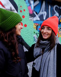 Kaos Yarn Luxury Soft Merino (225 m / 50 g) in “passionate” (red hat) or “generous” (green hat), held double, 3 balls