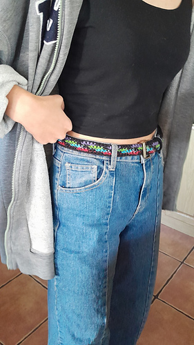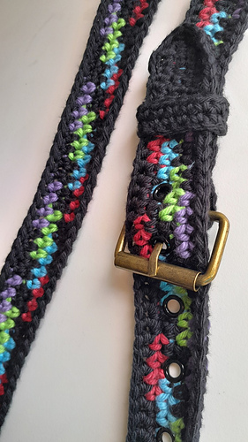 This cotton belt is worked in one direction only, some rows with the black yarn only, others alternating the black with a colour (hence “colourburst”).