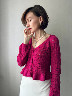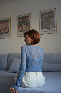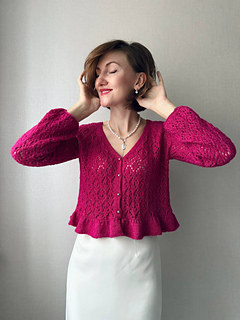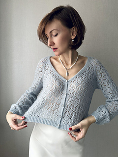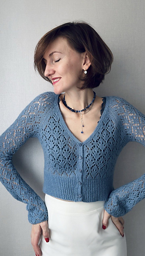 It knits very easily and quickly, despite the thin yarn and pattern. Each size is individually described with individual patterns. The knitting method is “raglan from the top,” with the pattern stitched. Size range 82-110 см.