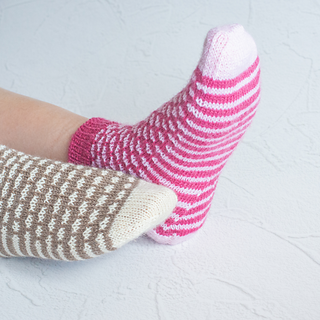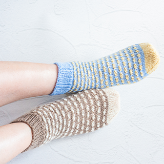 These fingering weight socks are knit cuff down with a heel flap, using the Magic Loop method. A slip stitch pattern creates the Mimosa flower pattern and only one color is used per round. A contrasting color is used for the heel and toe. Gusset decreases are hidden in the sole.