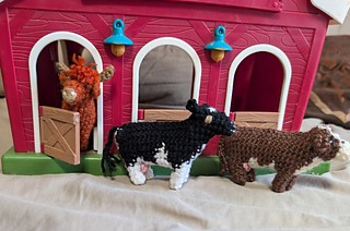 This little cow and calf pattern is a favorite of ours. Each cow stands approximately 4 inches tall when using worsted weight yarn. These animals are a great way to use up scraps of yarn that could be hard to use otherwise . This pattern is also no sew.