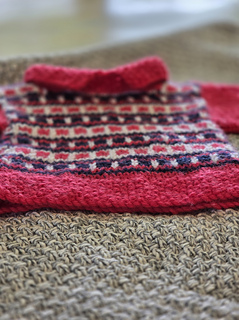 A miniature garment study exploring stranded colourwork, motif rhythm, and the interaction between surface pattern and garment structure.