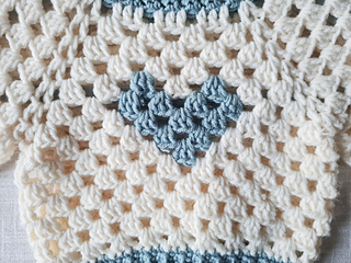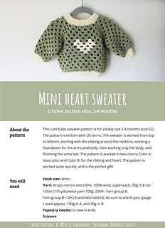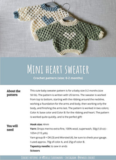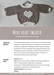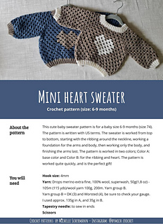 This cute baby sweater pattern is for a baby size 0-2 months (size 50-56), 2-4 months (62), 4-6 months (68) and 6-9 months (74). The pattern is written with US terms. The sweater is worked from top to bottom, starting with the ribbing around the neckline, working a foundation for the arms and body, then working only the body, and finishing the arms last. The pattern is worked in two colors; Color A: base color and Color B: for the ribbing and heart. The pattern is worked quite quickly, and is the perfect gift!